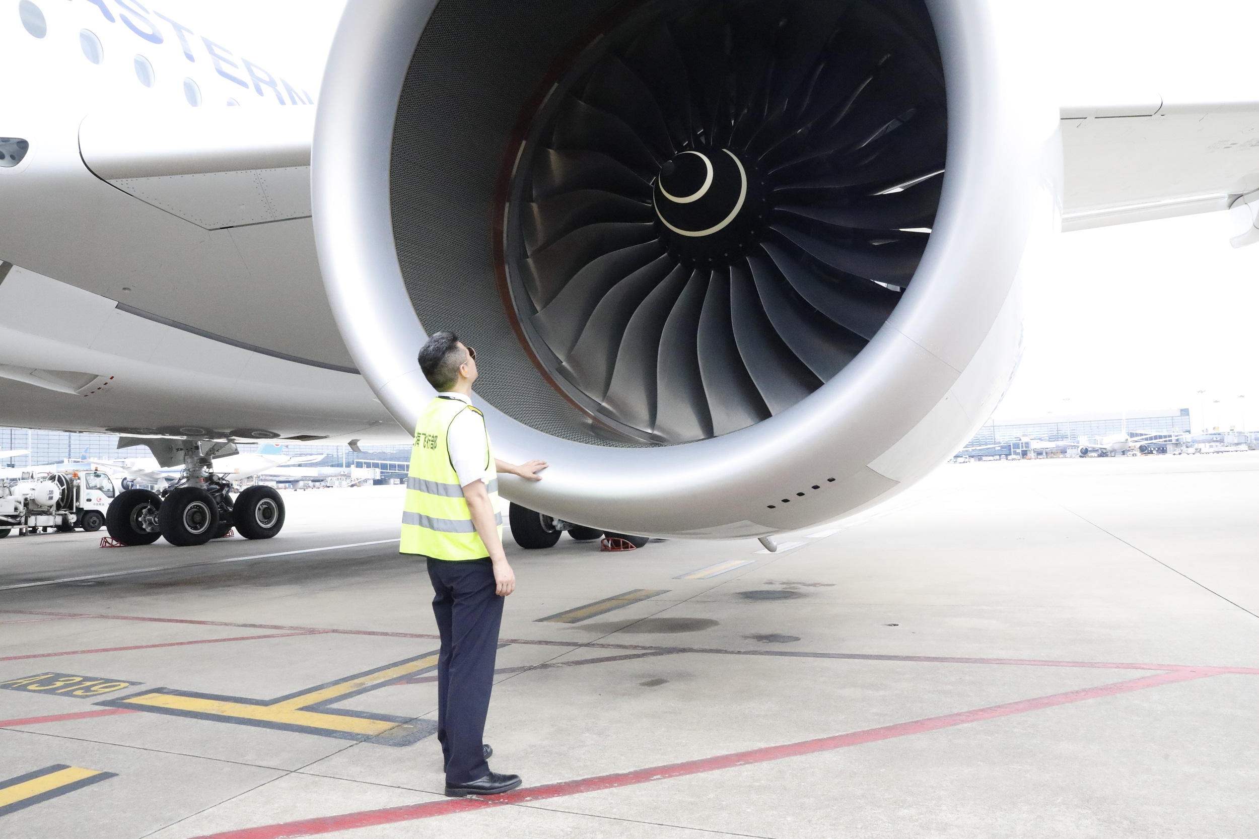 東航A350機長季紅華正在進行航班起飛前的繞機檢查工作