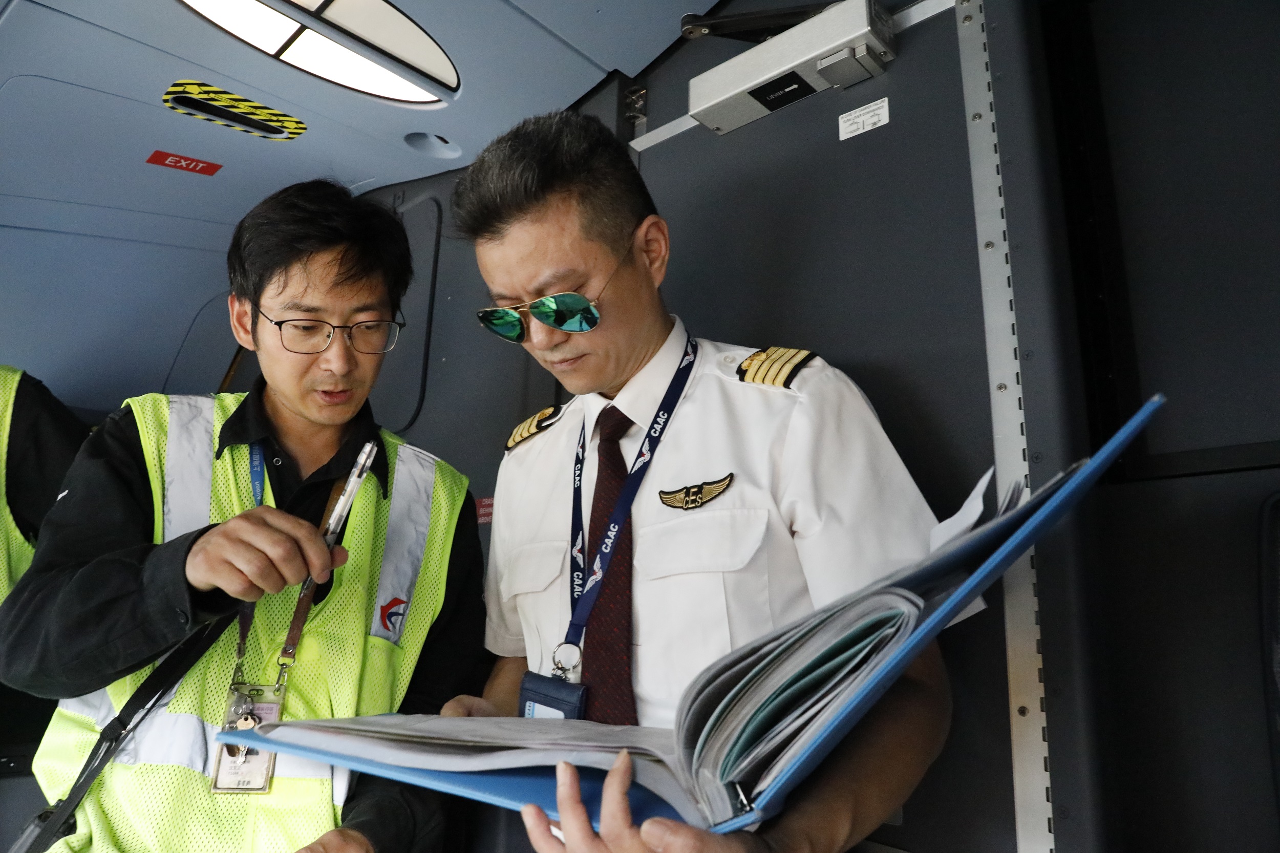 航班起飛前,機務工程師與東航A350機長季紅華進行最后的工作交接與確認