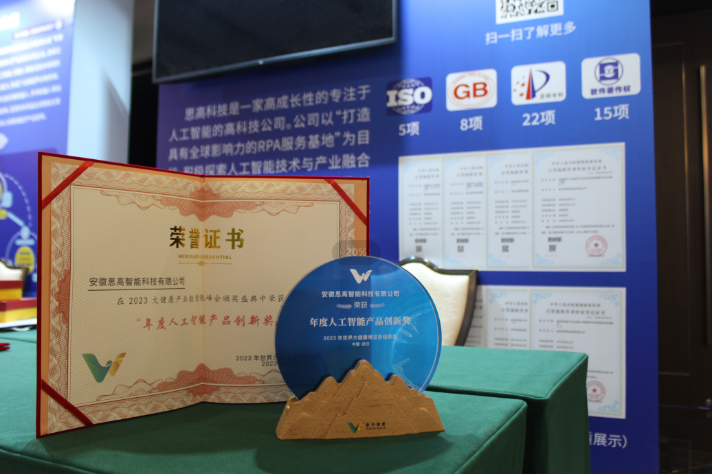 在頒獎環(huán)節(jié)中,思高科技憑借公司核心人工智能軟件產(chǎn)品——“RPA+AI數(shù)字員工”的產(chǎn)品實力和技術(shù)創(chuàng)新榮獲“年度人工智能產(chǎn)品創(chuàng)新獎 ”,思高科技董事長付磊憑借在助推大健康產(chǎn)業(yè)數(shù)字化轉(zhuǎn)型中的突出貢獻榮獲“年度大健康產(chǎn)業(yè)數(shù)字化創(chuàng)新人物獎”,獎項的獲得不僅是對公司人工智能技術(shù)的實力認(rèn)可,也是對公司在大健康產(chǎn)業(yè)的持續(xù)創(chuàng)新和進步的肯定。
