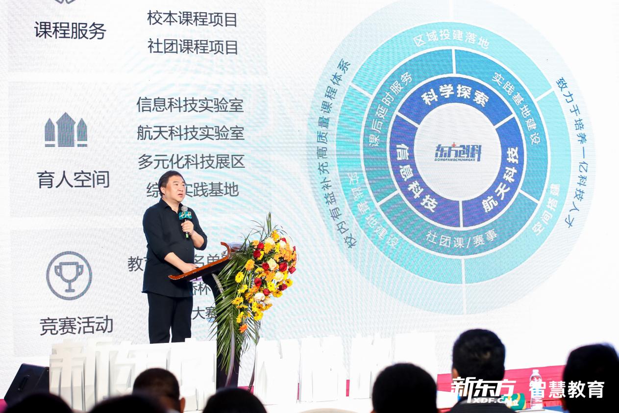 新東方智慧教育事業部副總經理劉斌立詳細介紹了全新的新東方智慧教育生態。他表示,新東方智慧教育的突出優勢在于構建起覆蓋K16全年齡段人群,涵蓋科創教育、數字化教學等各個領域,包含教學內容、硬件、工具、平臺、服務的系統化解決方案,可以為教育主體提供“定制化”“菜單式”服務。