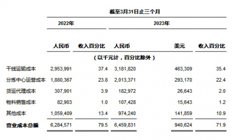 ?收入總額 為人民幣8,983.2百萬元(1,308.1百萬美元),較2022年同期的人民幣7,904.1百萬元增長13.7%。核心快遞服務收入較2022年同期增長16.1%,該增長是由于包裹量增長20.5%及單票價格下降3.7%的綜合影響所致。貨運代理服務收入較2022年同期減少41.8%,該減少主要是由于全球經濟疲弱導致跨境電商需求和定價下降所致。物料銷售收入主要由打印電子面單所需的熱敏紙銷售收入組成,同比增長30.8%,該等增長與包裹量增長趨勢吻合。其他收入主要由金融貸款業務組成。