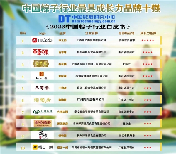 6月14日,中國數據研究中心發布“2023中國粽子行業最具成長力品牌十強榜”,中之杰躋身榜單第一名,上榜的還有百草味、杏花樓等知名粽子品牌。