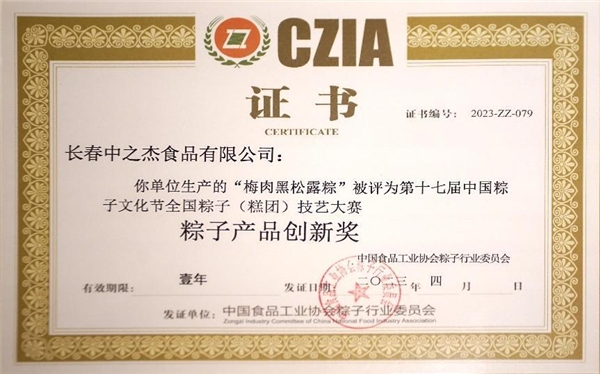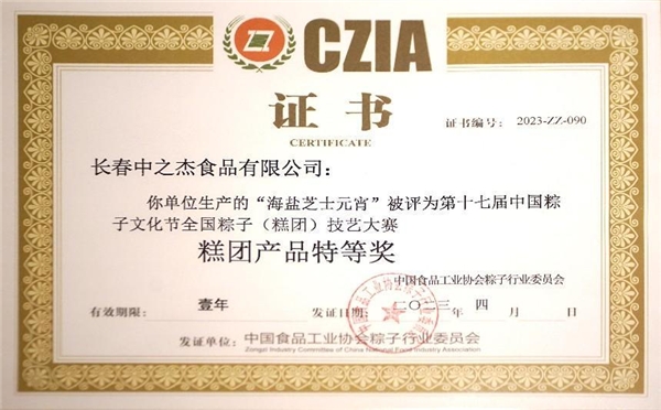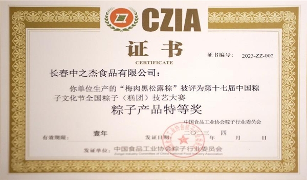 2023年4月19日,中之杰再次驚艷亮相中國粽子文化節,一舉斬獲三項全國大獎。中之杰的梅肉黑松露粽作為創新產品,從原料、工藝、口感、顏值等各個方面都受到行業專家推崇,同時斬獲全國(糕團)技藝大賽雙冠王——大賽最高獎項“粽子產品特等獎”和“粽子產品創新獎”,中之杰海鹽芝士炸不爆元宵榮獲全國(糕團)技藝大賽最高獎項“糕團產品特等獎”。