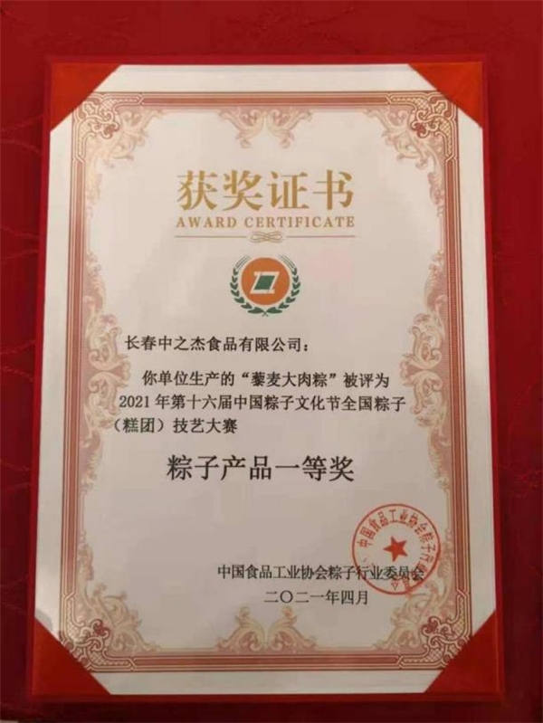 2021年,由中國食品行業協會舉辦的第16屆中國粽子文化節頒獎儀式上,中之杰“藜麥大黃米粽”獲得最佳創新獎、“藜麥大肉粽”獲得一等獎、“藜麥大黃米湯圓”獲得特等獎,可謂是滿譽而歸。并且這已經是中之杰在中國粽子文化節上連續5年蟬聯最高榮譽。