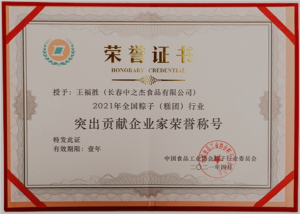 有鑒于中之杰長久以來對弘揚粽子文化事業的貢獻,在2021年,中之杰董事長王福勝先生獲得機構頒發的“突出貢獻企業家”稱號,體現出中之杰在行業內的領軍實力和頂流水平。王福勝還帶領中之杰分別榮獲 “長春民營經濟突出貢獻企業”和“民營經濟突出貢獻企業家”等榮譽。同時,王福勝還擔任中國食品工業協會粽子行業委員會會長職務,為行業發展盡職盡責。