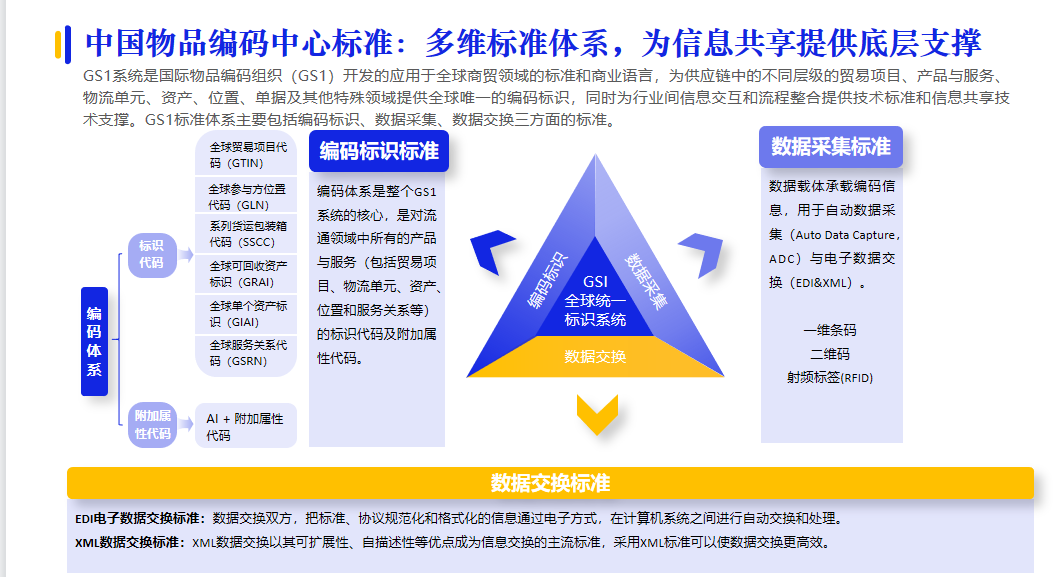 統一物品編碼標準一直是采購供應鏈領域的重點和難點。中國物品編碼中心的GS1系統是國際物品編碼組織(GS1)開發的應用于全球商貿領域的標準和商業語言,為供應鏈中的不同層級的貿易項目、產品與服務、物流單元、資產、位置、單據及其他特殊領域提供全球唯一的編碼標識,同時為行業間信息交互和流程整合提供技術標準和信息共享技術支撐。