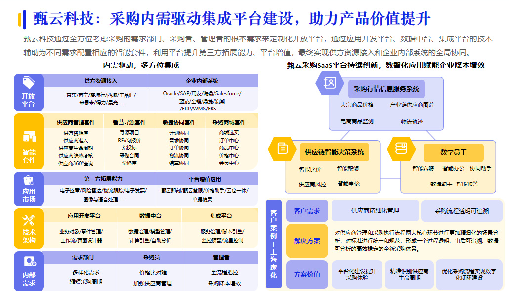 再例如,甄云科技通過全方位考慮采購的需求部門、采購者、管理者的根本需求來定制化開放平臺,實現供方資源接入和企業內部系統的全局協同。
