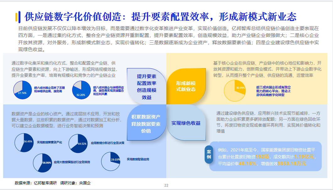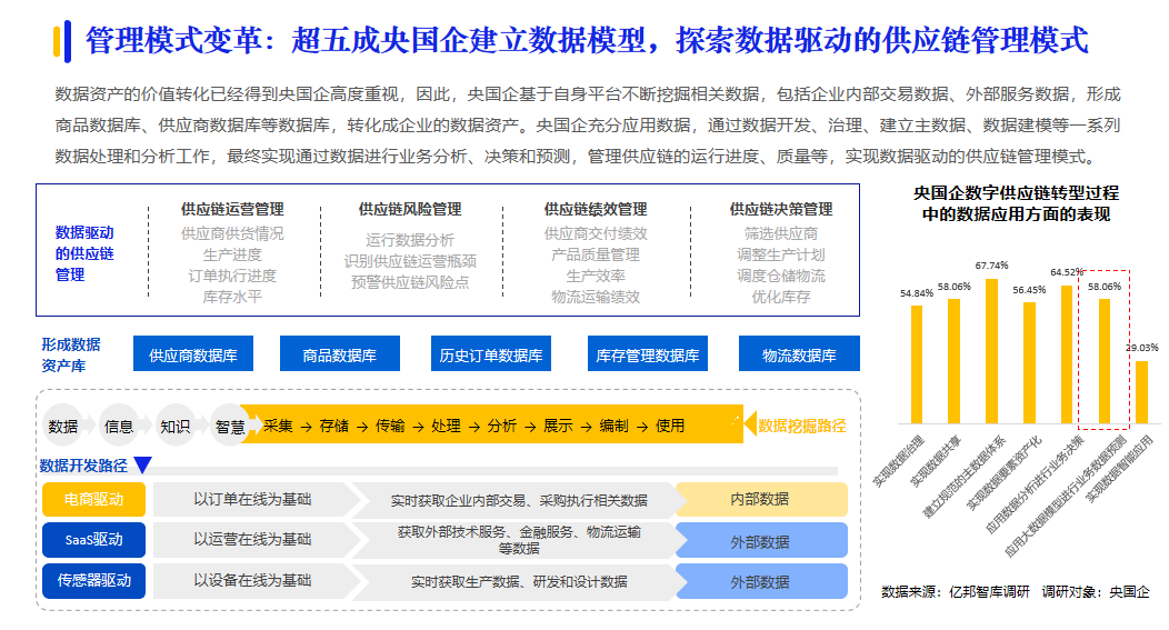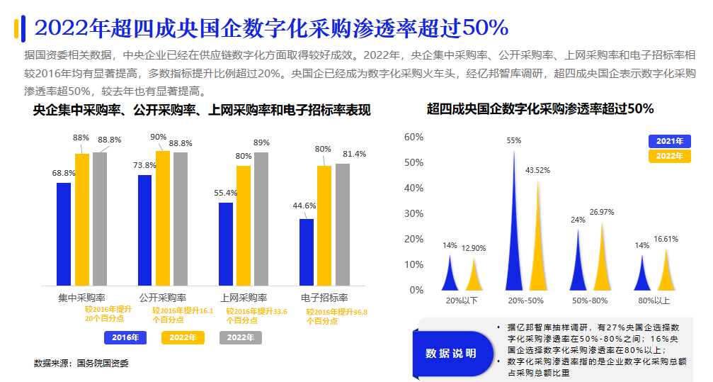 央國企在我國企業采購數字化進程中的火車頭效應越發明顯。據億邦智庫調研,超四成央國企表示數字化采購滲透率已經超過50%;形成了央國企先行,引發供應鏈各環節企業參與數字化創新變革的發展態勢。