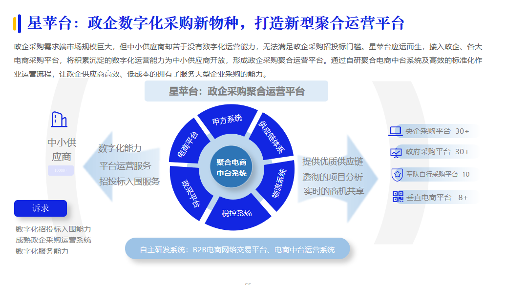 業務+數據的雙中臺模式,也是今年技術服務商在中臺方面的創新看點。從業務系統獲取的信息經過數據中臺的處理,再經過業務中臺的分析后,為企業提供智能決策支持。例如,星蘋臺通過自研聚合電商中臺系統,接入政企、各大電商采購平臺,將積累沉淀的數字化運營能力為中小供應商開放,讓其擁有了服務大型企業采購的能力。