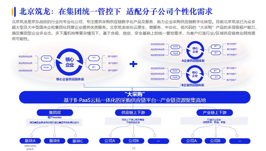 針對企業既要滿足標準化,又要滿足定制化業務需求,PaaS提供的服務更具有拓展性、集中性、適配性更強。北京筑龍基于多租戶體系,構建了大采購云私一體化B-PaaS平臺,既滿足多層級集中管理管控需求,又為下屬管理及執行機構提供更多個性化、自主性選擇,進而適應集團多元化和業務單元專業化發展。