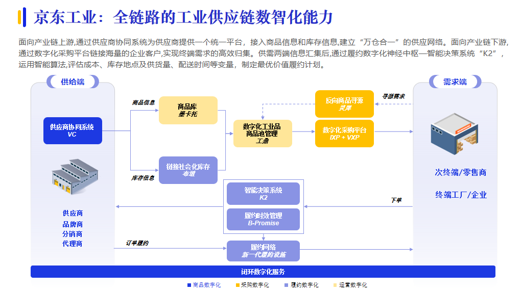 數字供應鏈發展已經從關注部分環節、部分參與者,轉向關注全鏈條、生態,因此,全鏈路數智供應鏈解決方案漸成主流。例如,京東工業面向產業鏈上下游,通過供應商協同系統建立“萬倉合一”的供應網絡;通過數字化采購平臺實現終端需求的高效歸集,再通過智能決策系統“K2”,制定最優價值履約計劃。