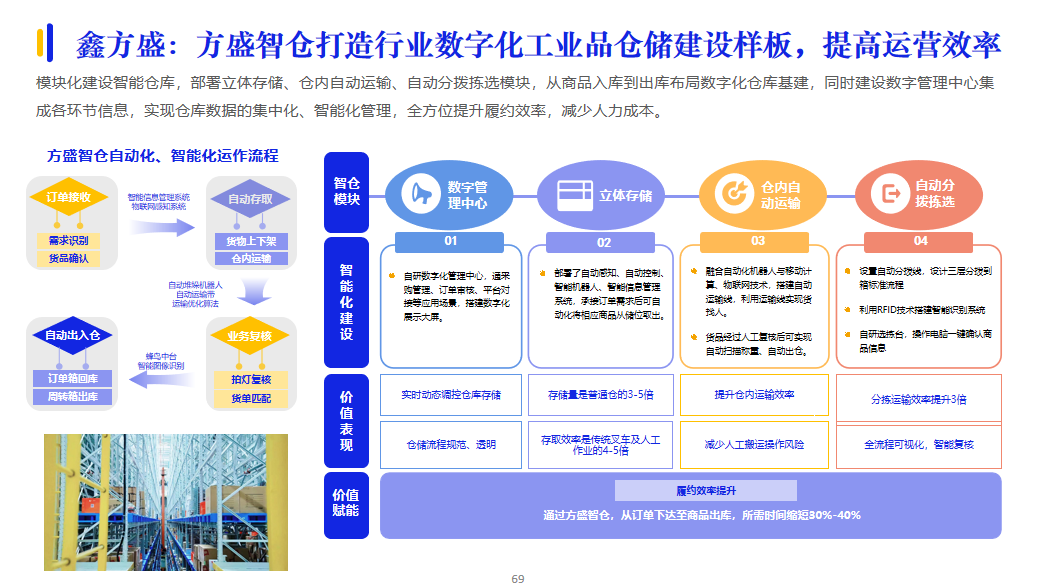 履約能力是供應商的核心競爭力。在履約服務方面,為了提高履約交付效率,供應商加大AI等技術投入應用,建設智能倉儲、智慧物流等數智供應鏈體系。例如,鑫方盛的方盛智倉打造行業數字化工業品倉儲建設樣板,實現倉庫數據的集中化、智能化管理,全方位提升履約效率,減少人力成本。