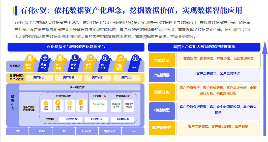 數字化采購帶來三大供應鏈模式變革:商業模式、管理模式和服務模式。核心企業依托資源聚集優勢,將其資源整合能力和管理能力向外開放和輸出,提供開放的平臺,實現盈利,引起商業模式變革;同時,數據價值逐漸被釋放,實現數據驅動的供應鏈管理模式的變革;例如:石化e貿落實數據資產化理念,搭建數據中臺集中處理業務數據,實現數據智能應用。