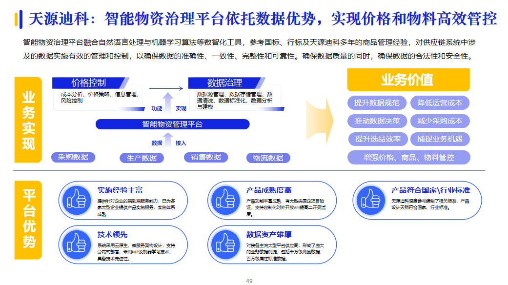 部分央國企會根據企業自身的數字化薄弱點,采取有針對性地補齊斷點的實施策略,包括供建立應商協同管理系統、優化物資分類與編碼設計、建立供應商管理體系、建設電商采購平臺、設計倉儲管理體系等內容。例如:天源迪科在智能物資治理方面,提出了價格和物料高效管控的解決方案,有效確保價格數據的合法性和安全性。