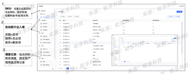 歐孚科技運用低代碼技術搭建了“物資進-出項“管理模塊。該模塊包括搭建SKU庫,對物資物料進行統一定義;配置采購調度的表單公式,使區域站點能根據實際領用情況進行填寫;根據各站點領用數據,快速統計物料成本并進行庫存盤點管理。