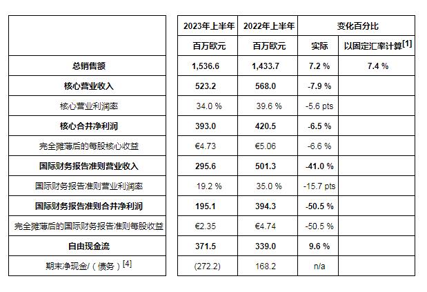 所有財務(wù)數(shù)據(jù)均以百萬歐元(€m)為單位。除非另有說明,本報告的業(yè)績涵蓋2023年6月30日之前的6個月期間(2023年上半年)和2023年6月30日之前的3個月期間(2023年第二季度),而進(jìn)行數(shù)據(jù)對比的對象為2022年6月30日之前的6個月期間(2022年上半年)和2022年6月30日之前的3個月期間(2022年第二季度)。除非另有說明,否則評論基于2023年上半年的業(yè)績。所有評論和較之前業(yè)績的比較均不包括2022年7月剝離的多元健康(CHC)業(yè)務(wù)的業(yè)績。