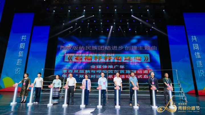 開幕式上,南疆與北疆,西雙版納與呼倫貝爾,以“中華民族一家親,同心共筑中國夢”為總目標,以首屆西雙版納雨林合唱節為契機,開啟兩地“雙城(民族團結)對話”,打造“民族團結+文化旅游”創新發展模式。中共西雙版納州委副書記、州委統戰部部長王嘉玲等領導為“西雙版納民族團結進步創建主題曲《石榴籽籽心連心》全媒體推廣年、西雙版納與呼倫貝爾民族團結進步創建“雙城對話”系列活動”進行了創意啟動。