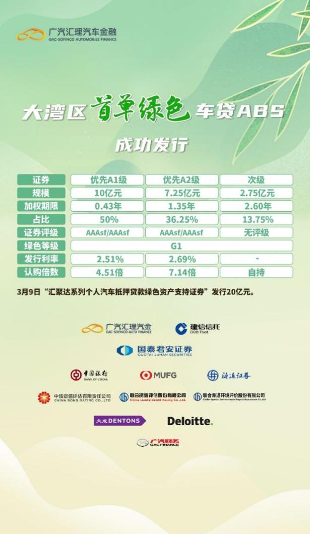 與此同時,廣汽匯理良好的綠色金融資產也獲得了資本市場的認可。今年3月9日,廣汽匯理發行了粵港澳大灣區首單綠色車貸ABS——匯聚達2023年第一期個人汽車抵押貸款綠色資產支持證券。本次入池資產均為廣汽埃安品牌新能源汽車個人貸款,經綠色認證機構聯合赤道評估分析,入池資產對應的新能源汽車,預計每年可實現二氧化碳減排6.07萬噸,節約標準煤2.85萬噸,有效地助力了我國節能減排事業開展。