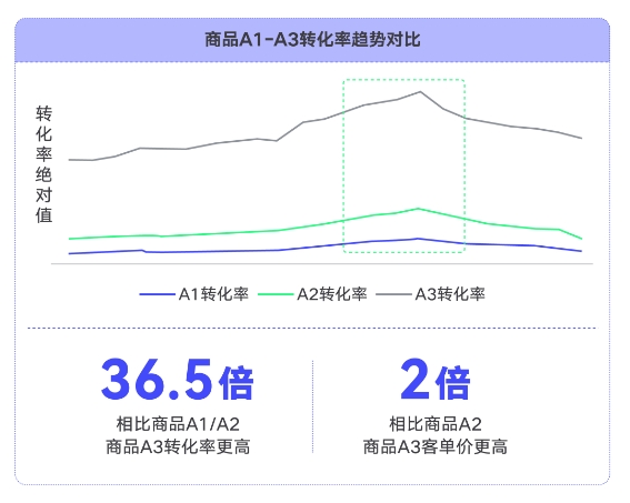 此外,商品5A從生意結(jié)果出發(fā),建立了人群商品行為和生意的關(guān)聯(lián)。其中,商品A3的樞紐價值尤其值得關(guān)注。相比商品A1/A2,商品A3的轉(zhuǎn)化率高出36.5倍;相比商品A2,商品A3的客單價高出2倍。這意味著在抖音生態(tài)內(nèi),商品A3人群對商品的喜愛程度更高,且更愿意購買該商品。品牌商家可以重點錨定商品A3人群進行種草,放大營銷效果,在市場競爭中占據(jù)優(yōu)勢。