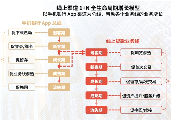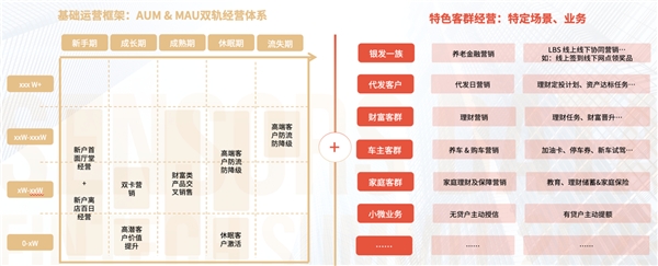 在 MAU + AUM 雙軌客群經營模式下,接入特色客群、業務條線的經營體系,進行經營策略補碼,完善經營策略體系,使得線上經營更加立體。MAU + AUM 雙軌客群經營模式在基礎運營框架體系中增加了“生命周期”的維度,生命周期是培育客戶的過程。金融機構還可以在基礎框架上根據特定的業務場景和主題,制定相應的經營策略。