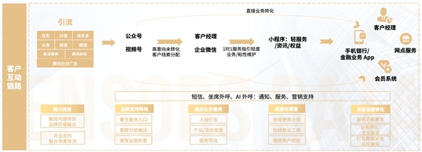 金融企業在客戶全鏈路互動與經營上,涉及到的渠道觸點也比較多。通常,在引流階段,客戶通過交易型 App、資訊類 App、種草媒體等進行互動,之后進入公眾號、視頻號為主的公私域轉換的形態,如果轉化周期較長,還會通過客戶經理和企業微信進行 1V1 服務引導和關系維護,還可以直接導量到小程序或 H5 進行輕轉化,以及到手機銀行、金融業務 App,結合客戶經理、網點服務和會員系統加強后鏈路深度運營。