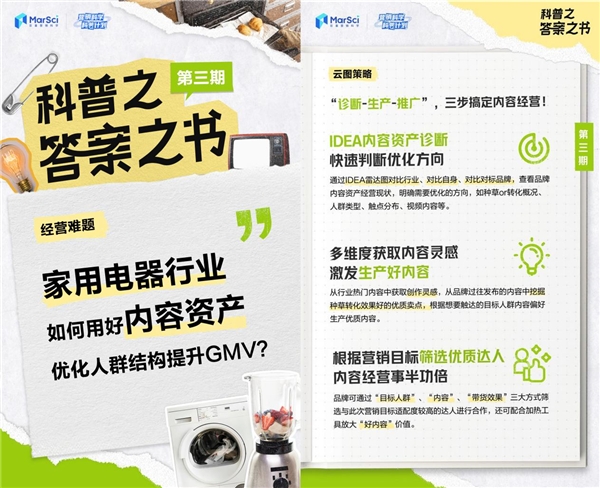 本期的「科普之答案之書」正是以家用電器行業(yè)為案例,結(jié)合巨量云圖「內(nèi)容」 和「達(dá)人營(yíng)銷」 模塊的產(chǎn)品能力,從內(nèi)容資產(chǎn)診斷、創(chuàng)意內(nèi)容生產(chǎn)、適配達(dá)人篩選一步步指導(dǎo)商家如何用好內(nèi)容資產(chǎn)、優(yōu)化人群結(jié)構(gòu)來(lái)提升GMV。