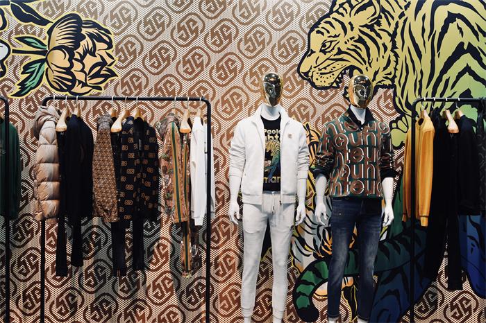 除了注重客戶體驗,現場服裝陳列搭配及展館搭建也很有講究。展廳內,第三代OT原創圖案與前Gucci設計師Paola Smania的“虎嗅薔薇”聯名印花,交相輝映,彰顯著歐度品牌的風格與調性。墻面上老花、猛虎、花卉幾大元素渾然天成,帶來強烈的視覺藝術美感。左側墻面還展出了《歐度與清華大學藝術與科學研究中心色彩研究所》有關中國男裝色彩研究的合作報告。