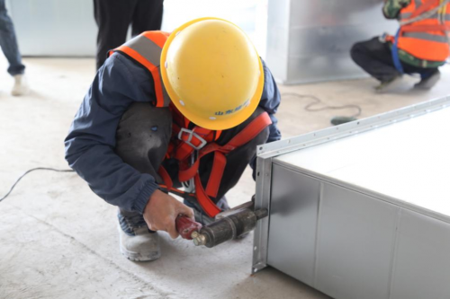 本次競賽分為風管加工及安裝、支架焊接兩項分項競賽。在風管加工及安裝分項競賽中,評委組選取防排煙系統分支三通作為競賽內容,提供風管三通半成品部件,參賽工人結合原設計圖紙,開展風管合口、法蘭鉚接及風管安裝作業。在支架焊接分項競賽中,評委組選取統一的綜合支架,繪制大樣圖,提供相關工具及材料,參賽人員按照圖紙下料、焊接并完成綜合支架施工。