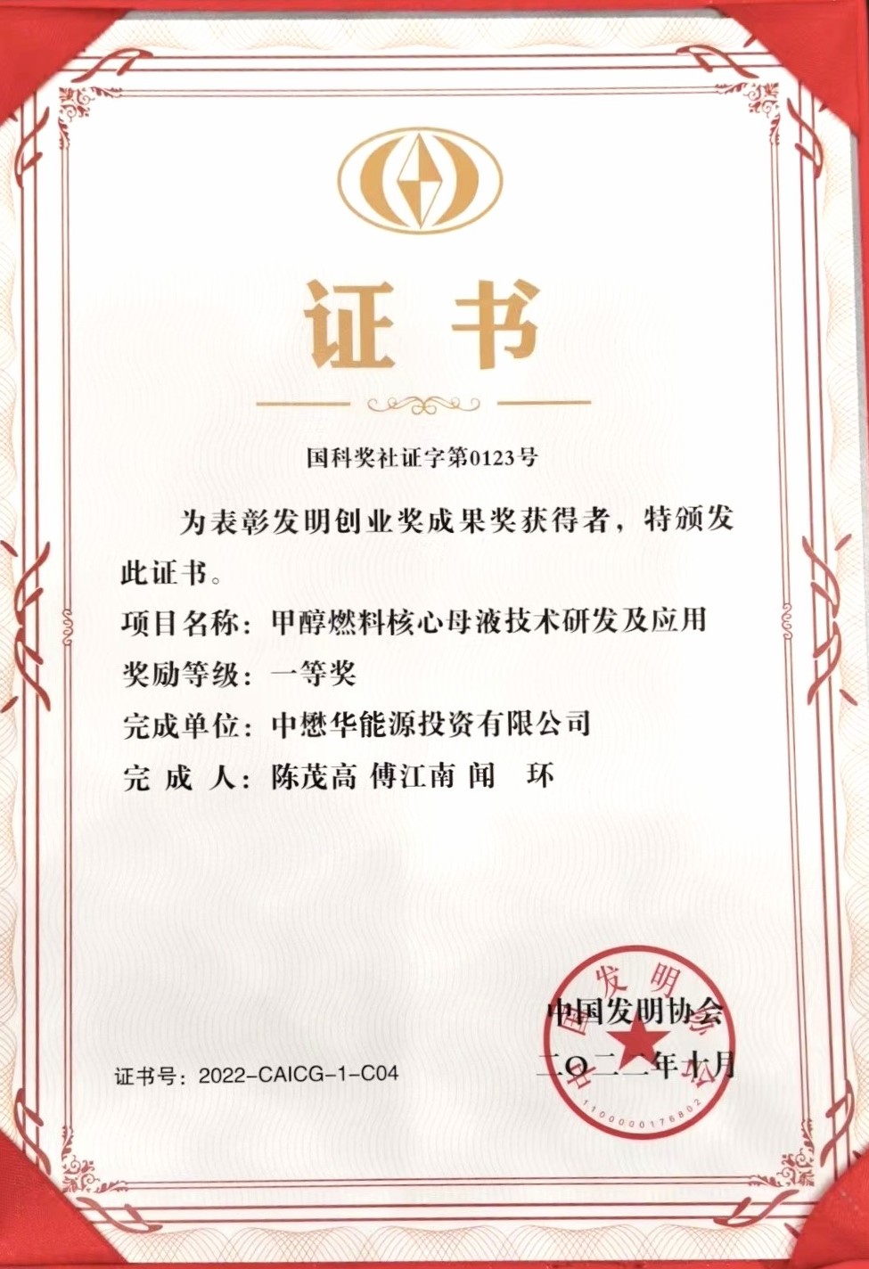 4月25日,由中國發明協會、科技日報社、國家科學技術獎勵工作辦公室、中國知識產權報社共同舉辦的第十七屆中國發明家論壇暨發明創業獎頒獎典禮在京舉行。第十屆全國人大常委會副委員長、中國關心下一代工作委員會主任顧秀蓮,科學技術部黨組成員、副部長,中國發明協會理事長吳朝暉,國家知識產權局專利局副局長王嵐濤等領導出席為獲獎代表頒獎。會上由中懋華能源投資有限公司完成的“甲醇燃料核心母液技術研發及應用”技術成果榮獲發明創業獎成果獎一等獎,中懋華能源投資有限公司董事長陳茂高作為獲獎代表出席頒獎典禮。