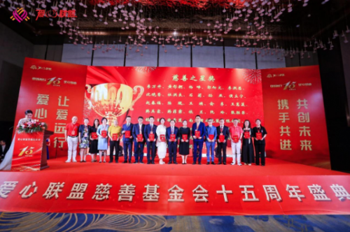 下午,愛心聯(lián)盟慈善基金會成立十五周年盛典隆重舉行。全國勞動模范、全國五一勞動獎?wù)芦@得者、全國道德模范、吉林省工商聯(lián)副主席、吉林省河南商會會長、愛心聯(lián)盟慈善基金會理事長李萬升,河南省政府駐上海辦副主任胡華杰,哈爾濱市政府駐上海辦經(jīng)協(xié)處處長田磊,中國浦東干部學(xué)院黨建研究中心主任吳濤,上海中信國旅總經(jīng)理羅良剛,山東馳恒投資發(fā)展有限公司董事長王久紅,昆山物流協(xié)會會長孫喜,來伊份股份有限公司高級副總裁趙漢利,新希望集團(tuán)草根資本投資部部長許云龍,上海歐邦醫(yī)療管理有限公司創(chuàng)始人崔海茹,眼界(上海)健康管理有限公司創(chuàng)始人謝攖寧,浙江省有機產(chǎn)業(yè)協(xié)會理事長胡珊,上海妃魚股份高級副總裁李財鋒,愛心聯(lián)盟慈善基金會執(zhí)行理事長楊崢,以及上海市工商聯(lián)直屬商會和各省市在滬異地商會秘書長等來自全國各地的精英和愛心聯(lián)盟成員300余人歡聚一堂,共同慶祝愛心聯(lián)盟慈善基金會成立十五周年。
