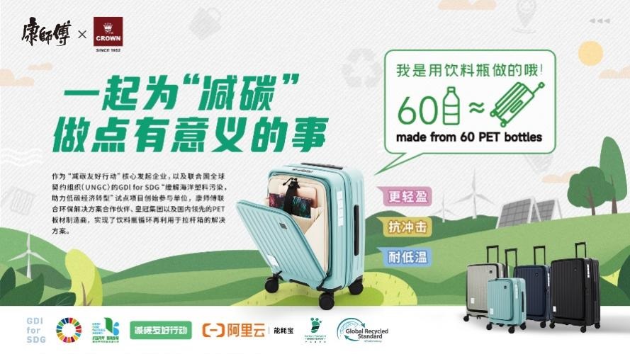 康師傅還作為主要發(fā)起單位之一攜手聯(lián)合國全球契約組織(UNGC)共同發(fā)起了GDI for SDG(全球發(fā)展倡議助力可持續(xù)發(fā)展目標(biāo))的首個試點項目——“緩解海洋塑料污染,助力低碳經(jīng)濟(jì)轉(zhuǎn)型”,與合作伙伴一道將回收的PET等使用后塑料制品,再造為多種生活消費(fèi)品,又通過電商平臺的銷售推廣,實現(xiàn)循環(huán)利用。在前不久的世界地球日,康師傅與環(huán)保解決方案合作伙伴共創(chuàng),實現(xiàn)了用康師傅廢棄飲料瓶制作拉桿箱、野餐墊、收納盒等環(huán)保周邊產(chǎn)品。其中聯(lián)合旅行箱品牌CROWN皇冠,共同推出環(huán)保旅行箱,也是在電商很受追捧,成為第一個商業(yè)化的rPET項目。由于應(yīng)用了專利技術(shù),旅行箱使用的回收塑料量大,比現(xiàn)有材料更環(huán)保,而且品質(zhì)更好,無異味,更耐沖擊,耐低溫。這個項目實現(xiàn)了從塑料循環(huán)利用到商業(yè)價值鏈的良性循環(huán),讓業(yè)界看到循環(huán)經(jīng)濟(jì)模式的曙光。
