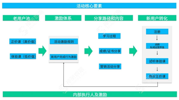 老用戶池:活動(dòng)設(shè)計(jì)時(shí),我們首先需要問(wèn)自己,活動(dòng)主要面向哪些用戶,這些用戶有什么特征,他們是否愿意進(jìn)行分享,分享的觸點(diǎn)應(yīng)該埋在哪兒,他們對(duì)哪些獎(jiǎng)勵(lì)是感興趣的,他們拉來(lái)新用戶轉(zhuǎn)化的難度如何,目標(biāo)怎么設(shè)計(jì)。很明顯,面向購(gòu)買正價(jià)課的老用戶和注冊(cè)用戶的活動(dòng)肯定是有差異的。