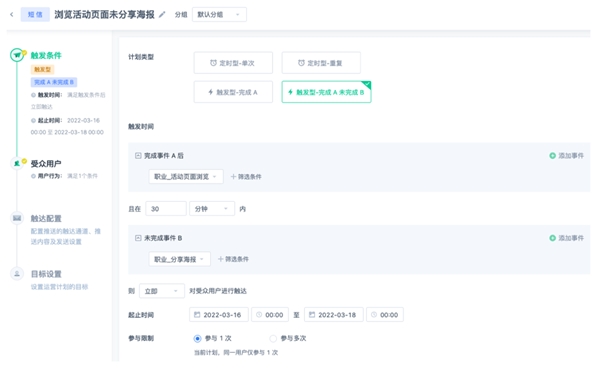 我們梳理了三種運(yùn)營(yíng)場(chǎng)景,對(duì)于未參與過(guò)轉(zhuǎn)介紹活動(dòng)的用戶可以促其首次使用;對(duì)于之前參與過(guò)但近期未參與的用戶進(jìn)行促活;對(duì)于完成階段性目標(biāo)的老用戶進(jìn)行觸達(dá)提醒,來(lái)優(yōu)化活動(dòng)的效果,如下表所示: