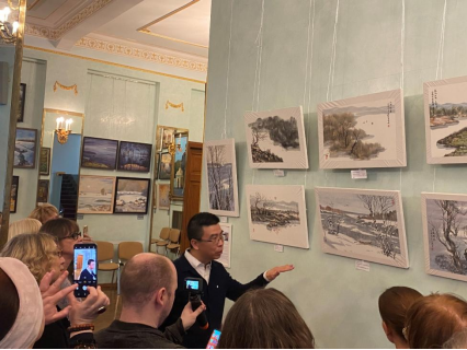 開幕當天,畫家劉子輿受邀走進俄羅斯國家科學院“大師課堂”,教授俄羅斯學員創作中國水墨畫。學員不少是俄羅斯知名的專業油畫家。劉子輿從畫面構圖、運筆、調墨、調色等方面進行深入講解,現場示范中國繪畫技巧,墨色在宣紙上產生濃淡變化,學員們很驚喜,非常感謝劉子輿帶領他們體驗了東方藝術之美。