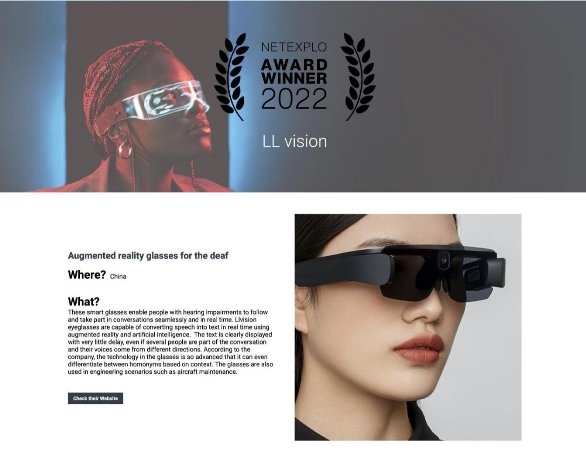 值得關(guān)注的是,在今年的評(píng)選中,亮亮視野智能AR字幕眼鏡成為唯一入選該獎(jiǎng)的中國(guó)代表,也是AR領(lǐng)域的唯一代表。在活動(dòng)期間Netexplo論壇官網(wǎng)面向全球觀眾進(jìn)行了一個(gè)投票活動(dòng),從10項(xiàng)創(chuàng)新中選出年度最佳創(chuàng)新成果,亮亮視野智能AR字幕眼鏡脫穎而出,與第一名票數(shù)極其接近,獲得第二名,彰顯了大眾對(duì)它的肯定和期待。