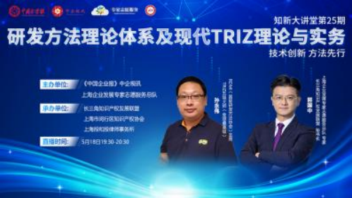 5月18日,中企視訊《知新大講堂》第25期節目線上開播。RDMI(國際研發方法協會)主席、TRIZ五級大師(全球最高級)、DFSS(六西格瑪設計)黑帶大師孫永偉博士做客中企視訊直播間,長三角知識產權發展聯盟秘書長郭國中擔任主持人,介紹了現代TRIZ理論體系的組成以及它在技術創新、新產品研發、專利布局、規避、挖掘等專利戰略、運用創新大幅降本等方面的重要作用。