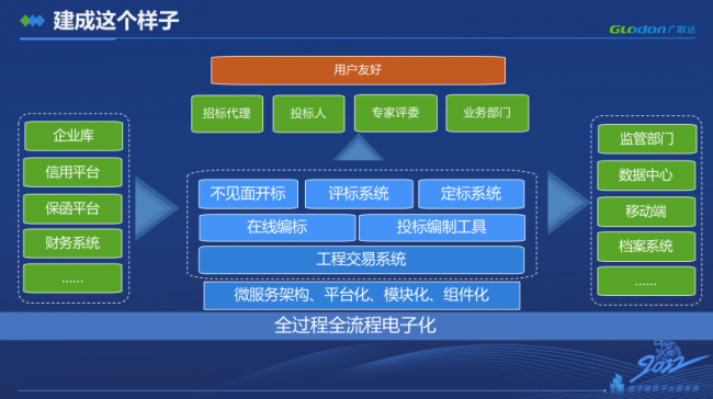 針對以上問題和挑戰,并結合客戶對靈活性的高度要求,廣聯達依托自身在工程建設及公共資源交易領域的實踐經驗,梳理了一套具有廣州特色建設工程交易解決方案。方案采用微服務架構,具有可拓展、平臺化、組件化和模塊化等特性,從全面、靈活、智能和創新四個方面,助力廣州交易集團重構建設工程交易系統,優化建設工程招投標體驗。