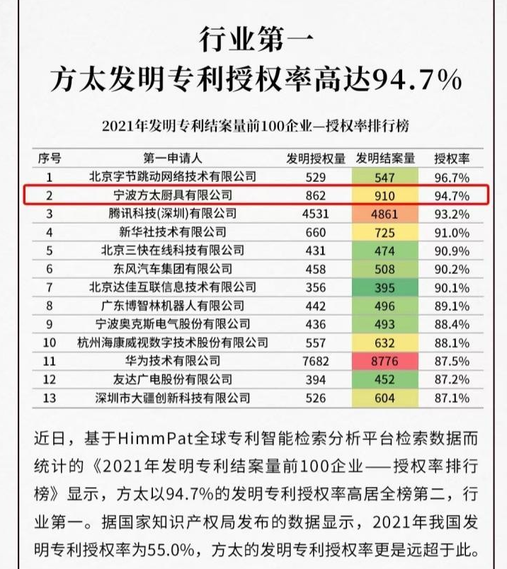 近日,基于HimmPat全球專利智能檢索分析平臺檢索數據而統計的《2021年發明專利結案量前100企業——授權率排行榜》顯示,廚電龍頭企業方太以94.7%的發明專利授權率高居全榜第二,行業第一。據國家知識產權局發布的數據顯示,2021年我國發明專利授權率為55.0%,方太的專利授權率遙遙領先。