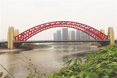與云龍灣大橋一箭之隔的天保灣大橋全長880米,主跨230米,橋寬43.5米,采用中承式鋼桁架拱橋施工工藝。目前為成都市同類型橋梁中跨度最長、橋梁樣式新穎、技術含量高、施工工序復雜,且跨越錦江涉水施工。