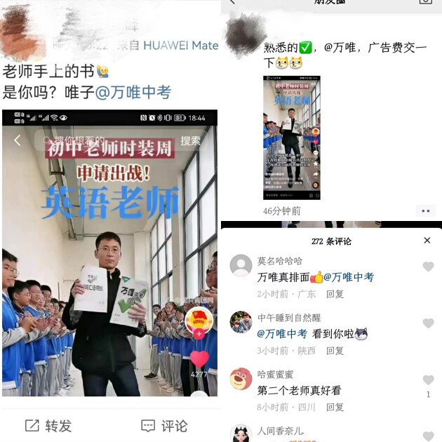 “王老師穿西服好帥啊”“吳老師真像標準的模特”“期待下一場老師T臺秀”……記者發現,該視頻得到了大量點贊轉發,幾乎每一位老師都收獲了大量評論和“粉絲”,尤其一位舉著英語資料的男教師,令許多網友驚呼仿佛又要考試了。原來,除了男老師“冷酷”的表情使大家聯想到自己曾經嚴肅的老師外,還因為他手里舉著一本《萬唯中考試題研究》。據了解,《萬唯中考試題研究》在全國30個省(區市)的初中校園中廣泛使用,因此當它出現時,不少網友直呼“熟悉”“青春回來了”。