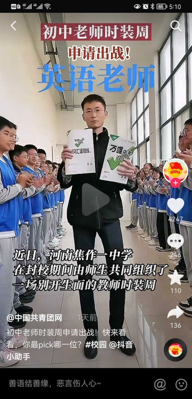 記者還注意到,“老師時裝秀”的相關視頻覆蓋面非常廣泛,在吉林、河北、河南、陜西、安徽、云南等多地校園均有出現,其中一段河南焦作的“走秀”短視頻更是得到了中國共青團網抖音賬號的轉發。據悉,該視頻來源于焦作的一所初中,語文、數學、英語、物理等各科老師幾乎都參與了“走秀”,學生們在一旁喝彩鼓掌,每個人臉上都洋溢著歡樂的笑容。