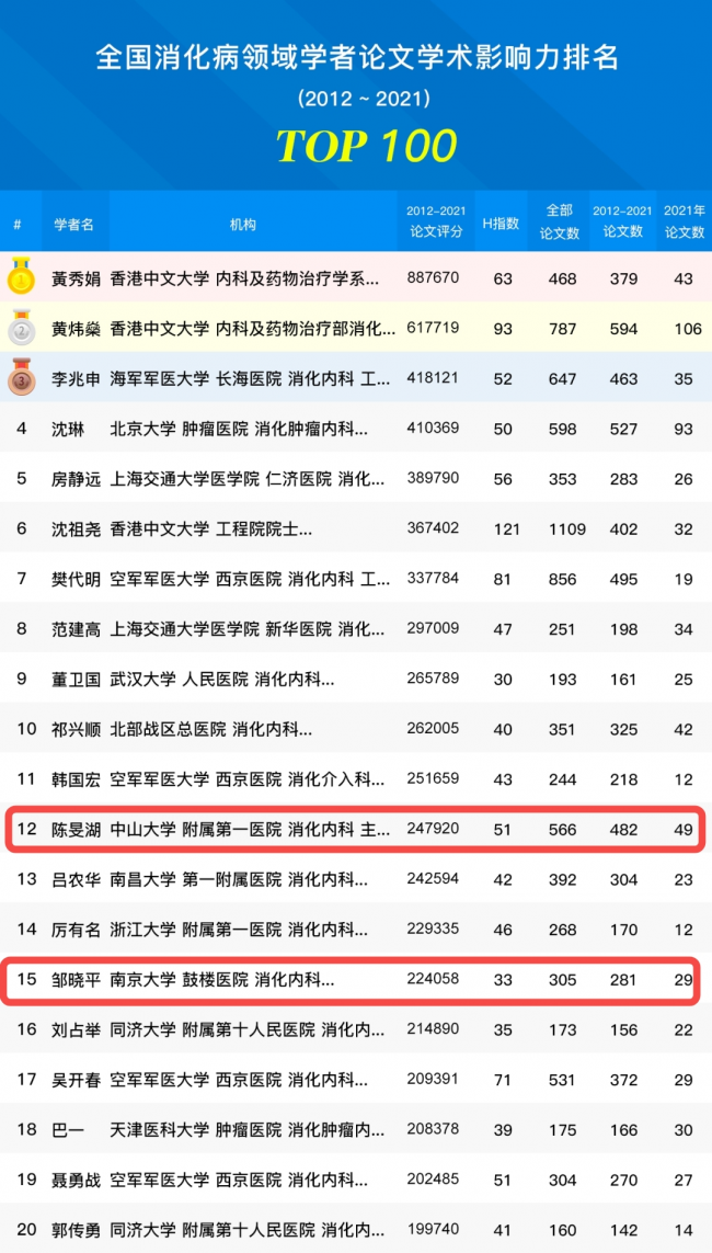 在今年全球學者庫發布的《2012-2021年全國消化病領域學者論文學術影響力排名》中,泰康醫療旗下深圳前海泰康國際醫院(籌)高級顧問陳旻湖教授與泰康仙林鼓樓醫院院長鄒曉平教授雙雙入選TOP100。其中,陳旻湖教授以H指數(在一定期間內發表的論文至少有h篇的被引頻次不低于h次)51、全部論文數566篇,位列全國總排名第12位;鄒曉平教授則以H指數33、全部論文數305篇,位列全國總排名第15位。