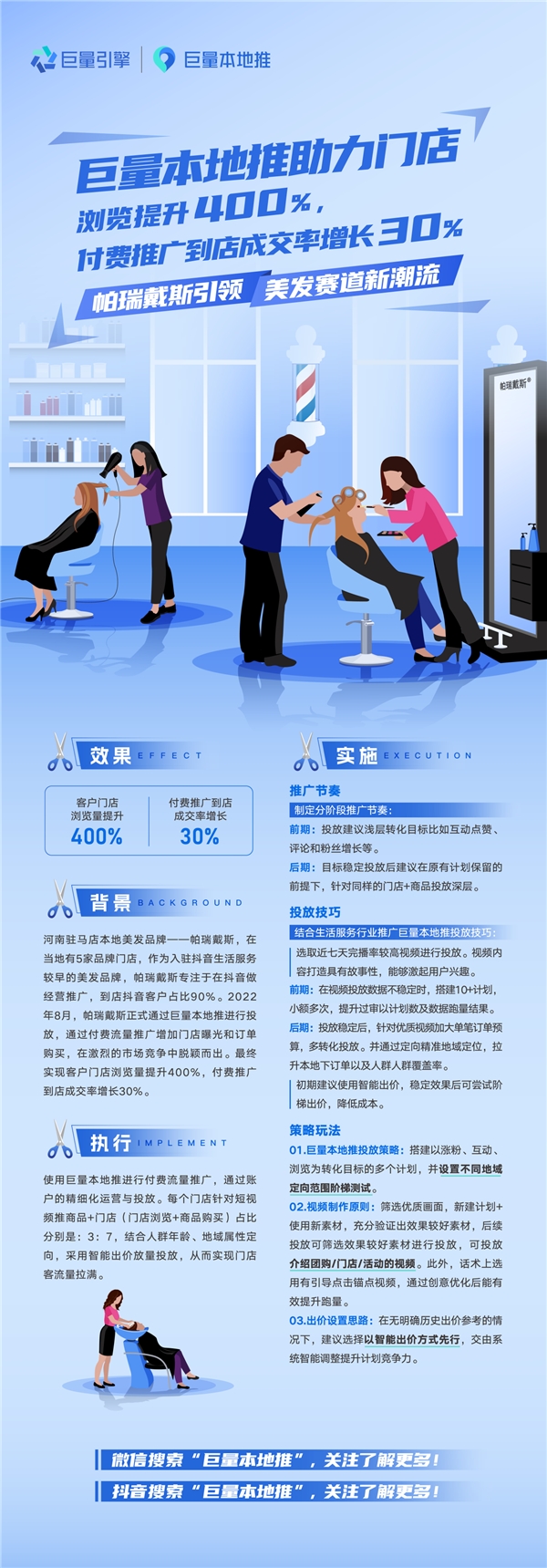 本地生意蘊藏著巨大商機,商家如何借助線上平臺或工具,挖掘更多增長機會呢?「巨量本地推」第二期極星案例大賽,正式揭曉最終獲獎案例榜,獲得「到綜」第一名的河南駐馬店本地美發品牌帕瑞戴斯,成功在諸多案例中脫穎而出,月均消耗提升4倍,付費推廣到店成交率增長30%,本地到店客戶源源不斷,給本地商家帶來了一些增長思路借鑒。