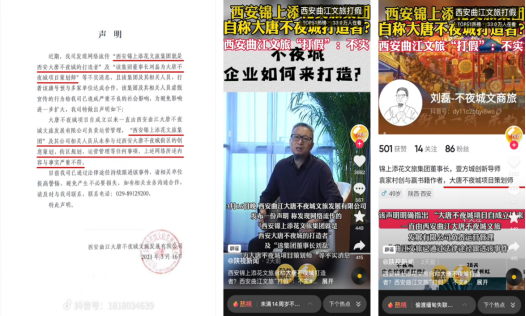 2023年3月16日,大唐不夜城官方率先在抖音、曲江文旅、大唐不夜城、曲江文化、微博、西安大唐不夜城等平臺官方認證賬號上全網發布聲明,該聲明指出:發現網絡流傳的“西安“錦上添花”就是西安大唐不夜城的打造者”及“該集團董事長劉磊為大唐不夜城項目策劃師”等不實消息,是假冒大唐不夜城品牌“該集團及其相關人員打著該旗號欲與多家單位達成合作,該集團及其相關人員虛假宣傳行為給我司已造成嚴重不良的社會影響。”