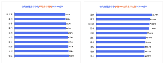 雖然哈爾濱通勤距離有所增加,但依舊是特大城市中綠色通勤指數最高的城市,沈陽緊隨其后。同時,哈爾濱的公共交通出行中平均步行距離短,且步行一公里內的出行比例較高。