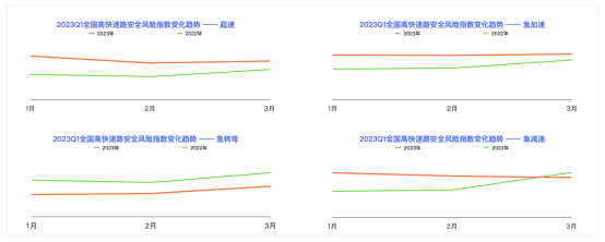數據顯示,全國高快速路的安全險指數環比2022第四季度下降8.16%,全國高快速路的危險駕駛行為(即三急一超:急加速、急減速、急轉彎和超速)與2022第一季度比較,超速、急轉彎的變化趨勢一致,急加速、急減速則在2023年3月呈現下降向好趨勢。