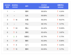 2023年第一季度,百城1小時通勤指數榜TOP10主要為二三線城市,其中TOP3城市是潮州、汕頭、中山,通勤一小時可達性越高,通勤幸福感越強;5公里通勤指數TOP10城市中有8個城市位于廣東省,其中佛山、東莞為新一線城市。