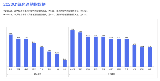 人口流動與交通的發展密不可分。同比2022第一季度,2023第一季度百城跨城遷徙規模指數都增,平均漲幅達到47.64%。最高漲幅城市為天津,漲幅達139.67%;北京、?安以漲幅116.20%、100.63%位居漲幅榜第二、第三。
