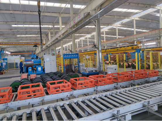 藍色自行小車把巨大的電纜軸送到既定位置,黃色的機械臂將線軸卡好,設備啟動后線纜開始自動纏繞,一盤整齊的電纜線慢慢成型。車間里,紅、黃、藍、白色的機械臂、自行小車等機械設備分工合作,有條不紊地生產。諾大的廠房中,零星行走著幾位身著藍色工裝、頭戴安全帽的工作人員。