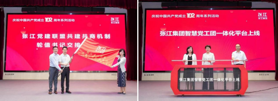 張江黨建聯盟第三屆輪值書記交接儀式(左)、張江集團智慧黨工團一體化平臺上線(右)